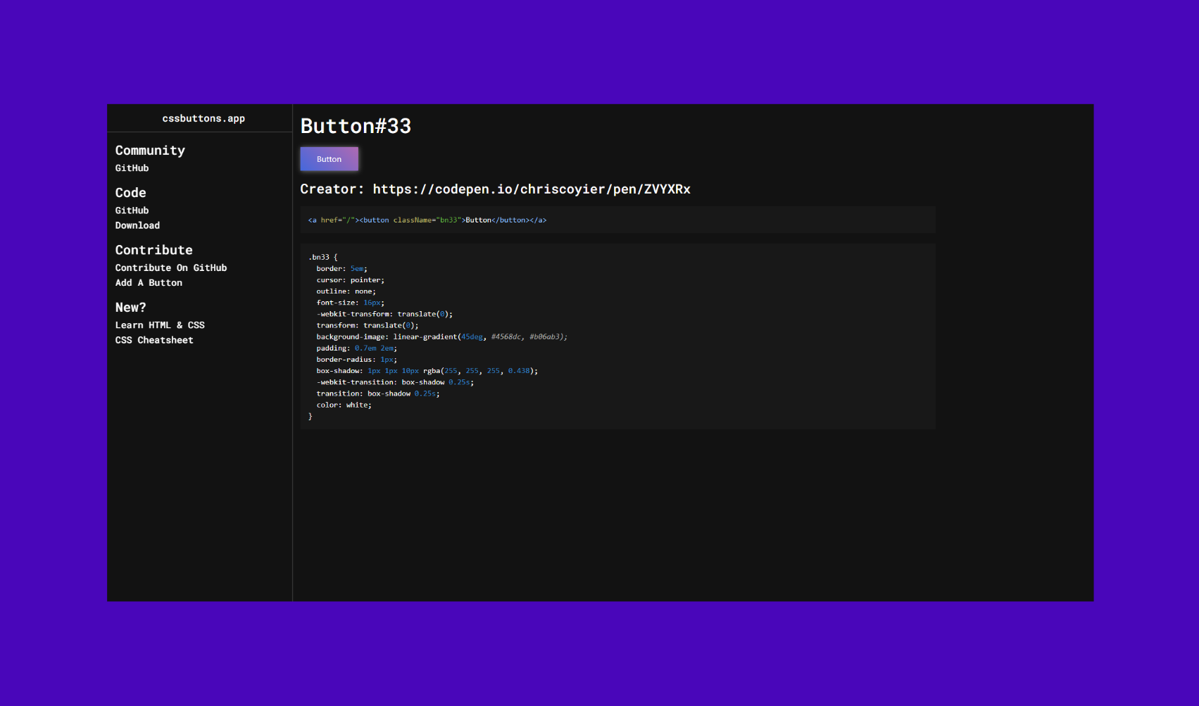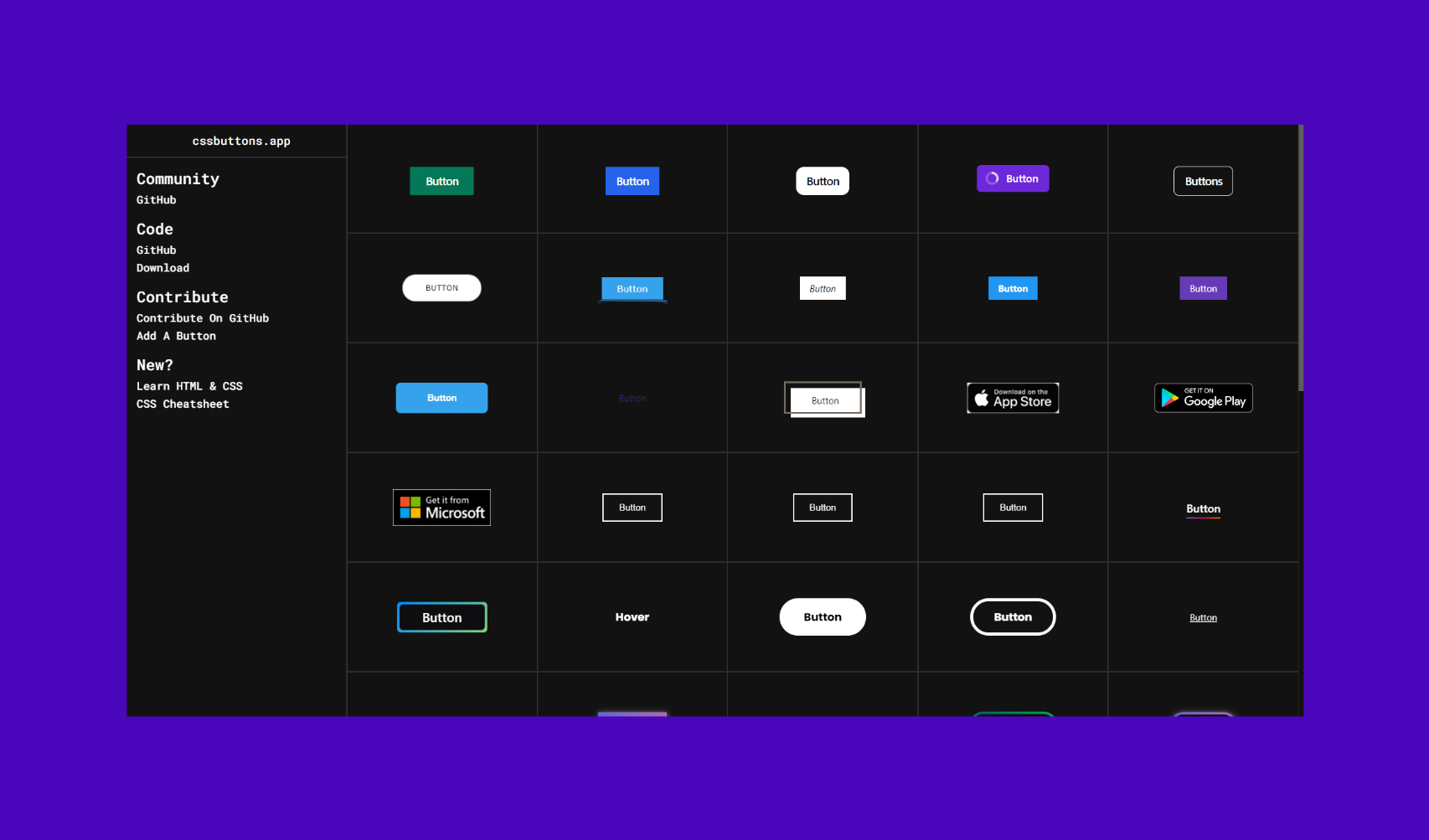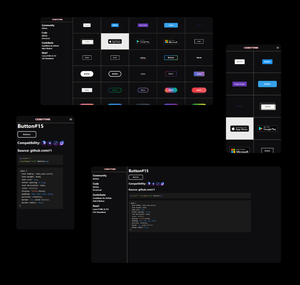 When I started thinking about cssbuttons I always needed a collection of buttons on a site which I could simply go to and paste the code when I needed. Before I had this idea I had to go to multiple different sites to find a button I liked and wanted to use for my project. I started having a bunch of different websites piled up in my notes from what buttons to use on the website I was working on at the time. So I came up with an idea to have a huge collection of buttons that I could simply copy & paste into my website.